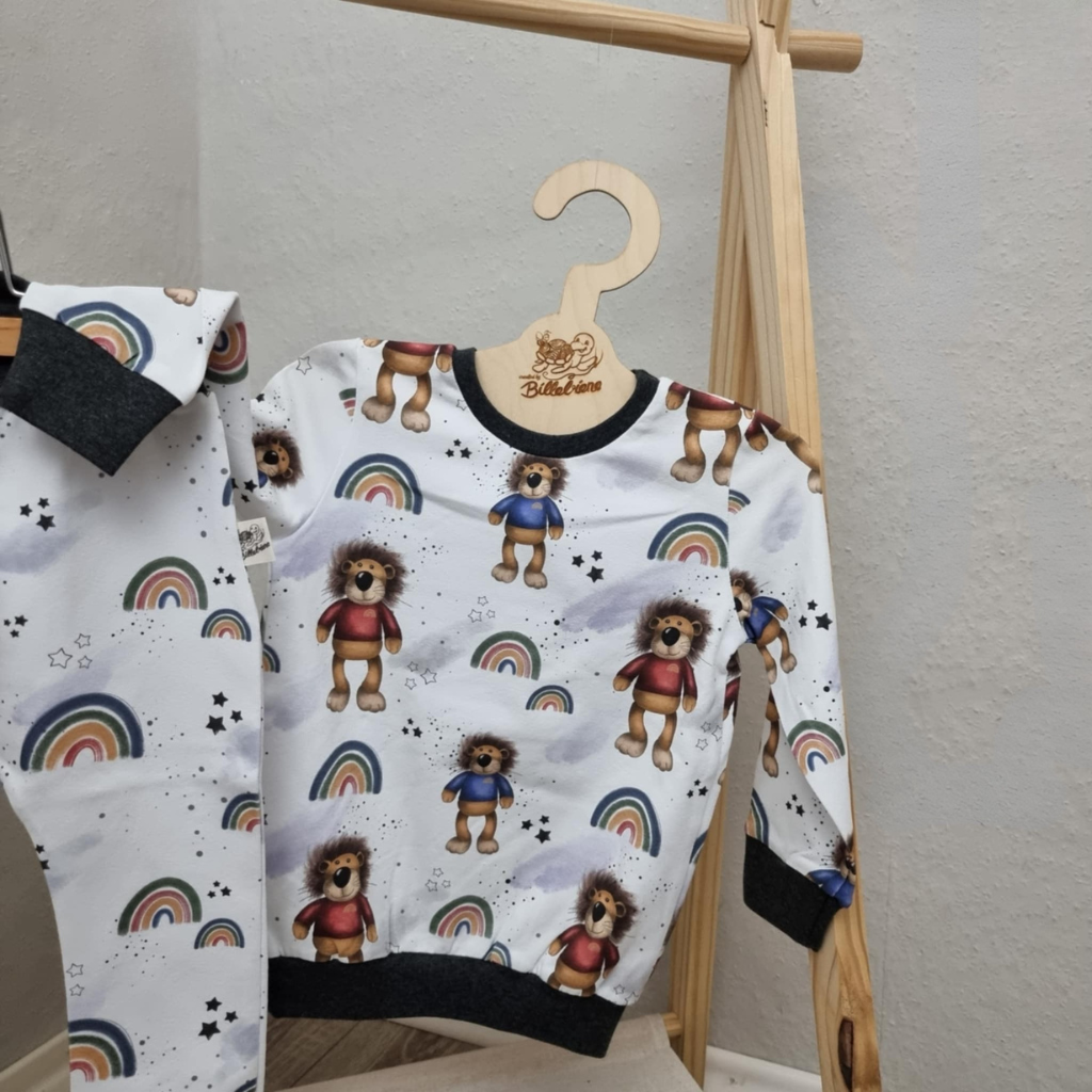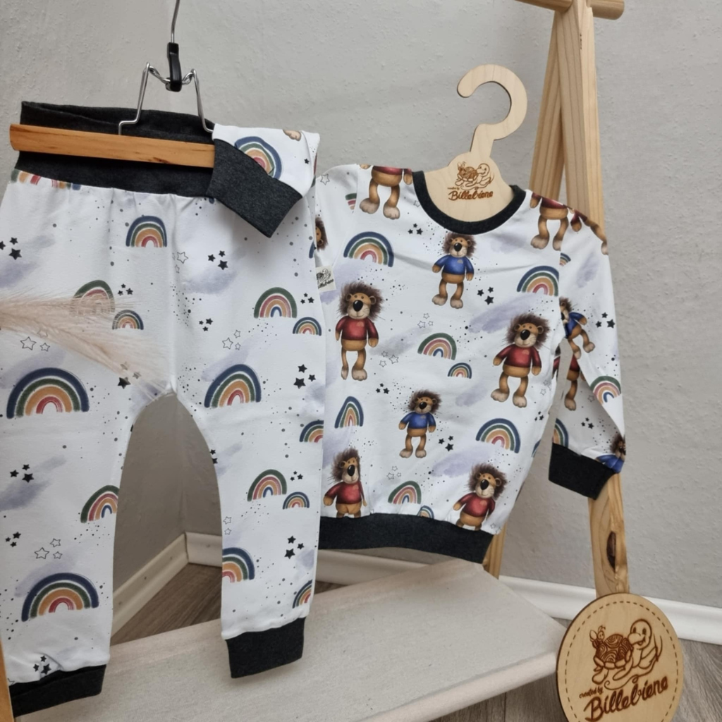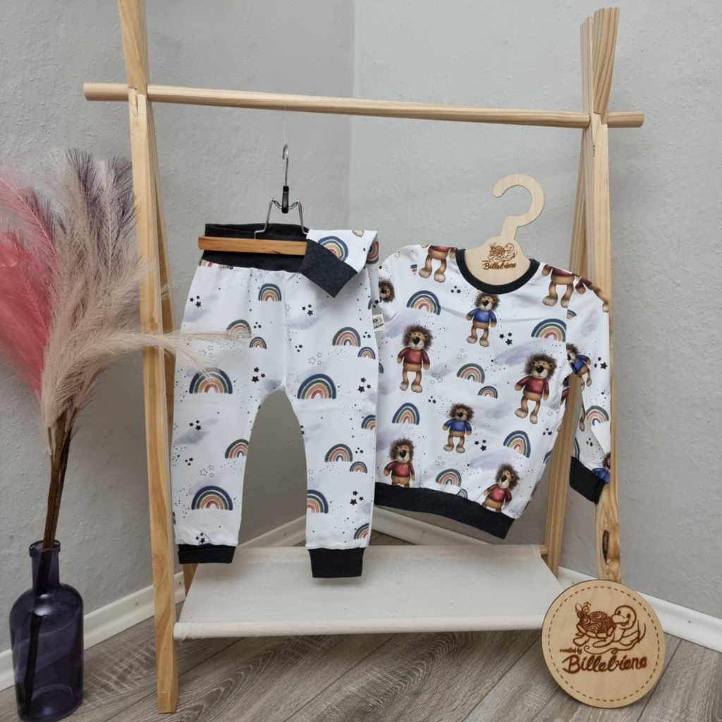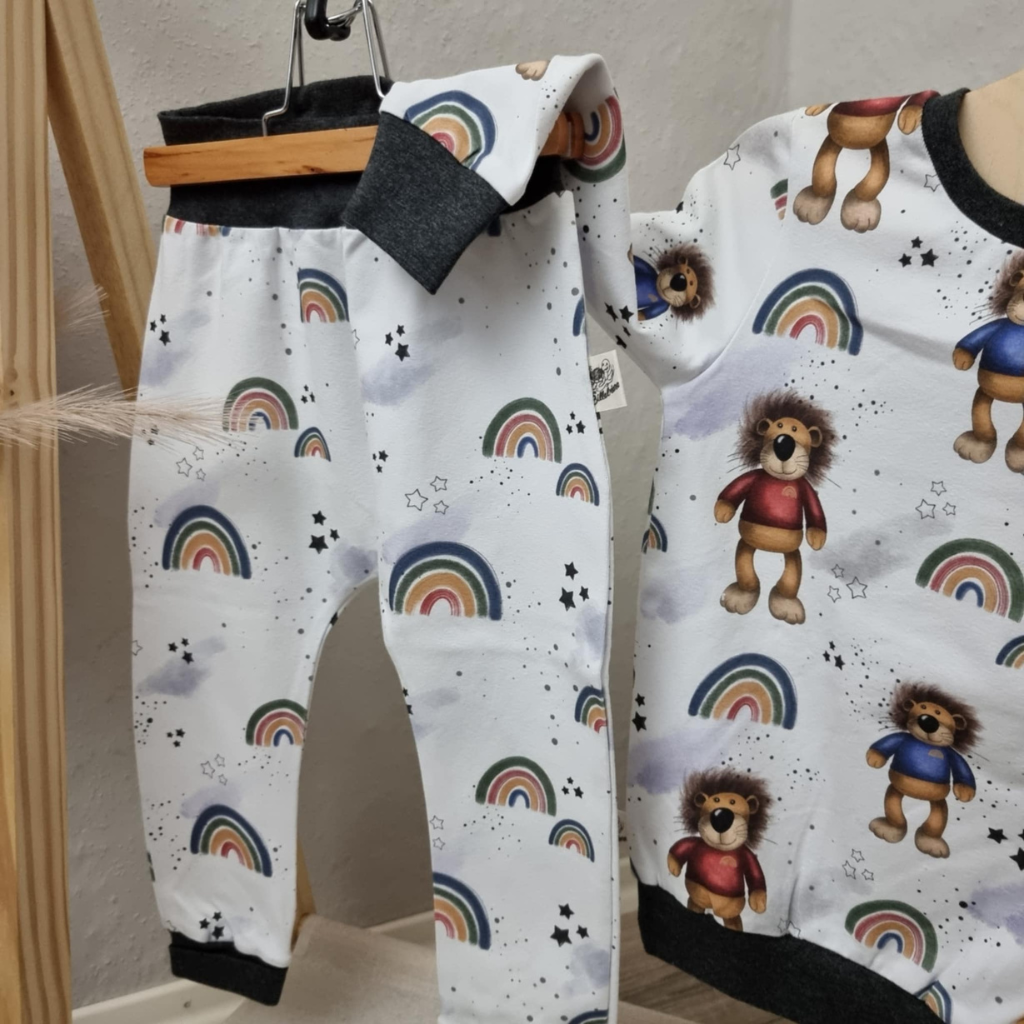 Dieses zauberhafte Set besteht aus einer bequemen Basic Hose und einem weichen Pullover in einem zuckersüßen Regenbogen/Löwen Design. Beide Teile überzeugen durch ihre bequeme Passform und schenken deinem Kind volle Bewegungsfreiheit – beim Spielen, Toben oder Entspannen.