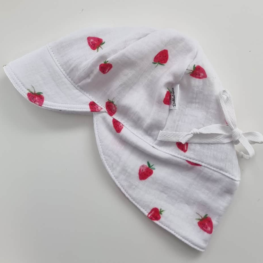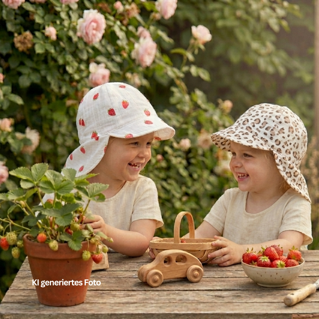 Dieser süße Sonnenhut mit Erdbeeren und aus weichem Musselin ist der perfekte Begleiter für sonnige Tage! Ob im Garten, auf dem Spielplatz oder im Urlaub. Dank des mitwachsenden Schnitts sitzt er nicht nur optimal, sondern begleitet dein Kind über mehrere Größen hinweg.
